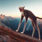 Prompt: Eine Katze mit 2 Meter langen Beinen und einem sehr großen Gebiss mit spitzen langen Zähnen, die in einem Gebirge klettert.